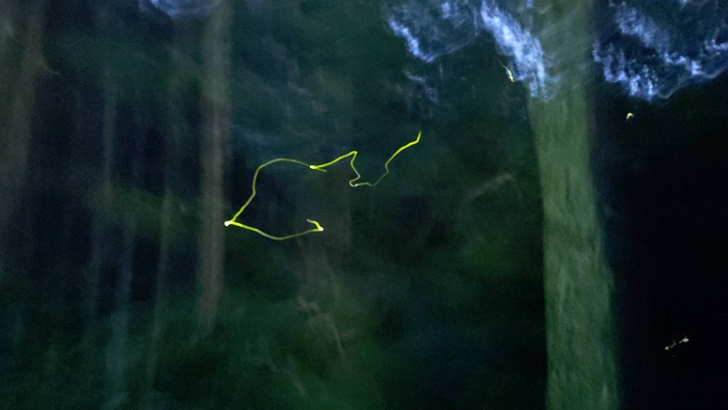 夕方日没過ぎると、カワニシを食べて成長したホタルが、今年も元気に舞い始めた。